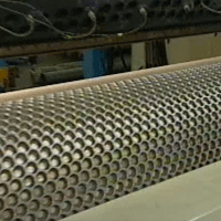 Während sich die Folie über diese Walzen bewegt, wird Luft angesaugt und in die Noppen geblasen, dies sind die späteren Luftblasen, die der Luftpolsterfolie ihre gute Schutzeigenschaften verleihen.